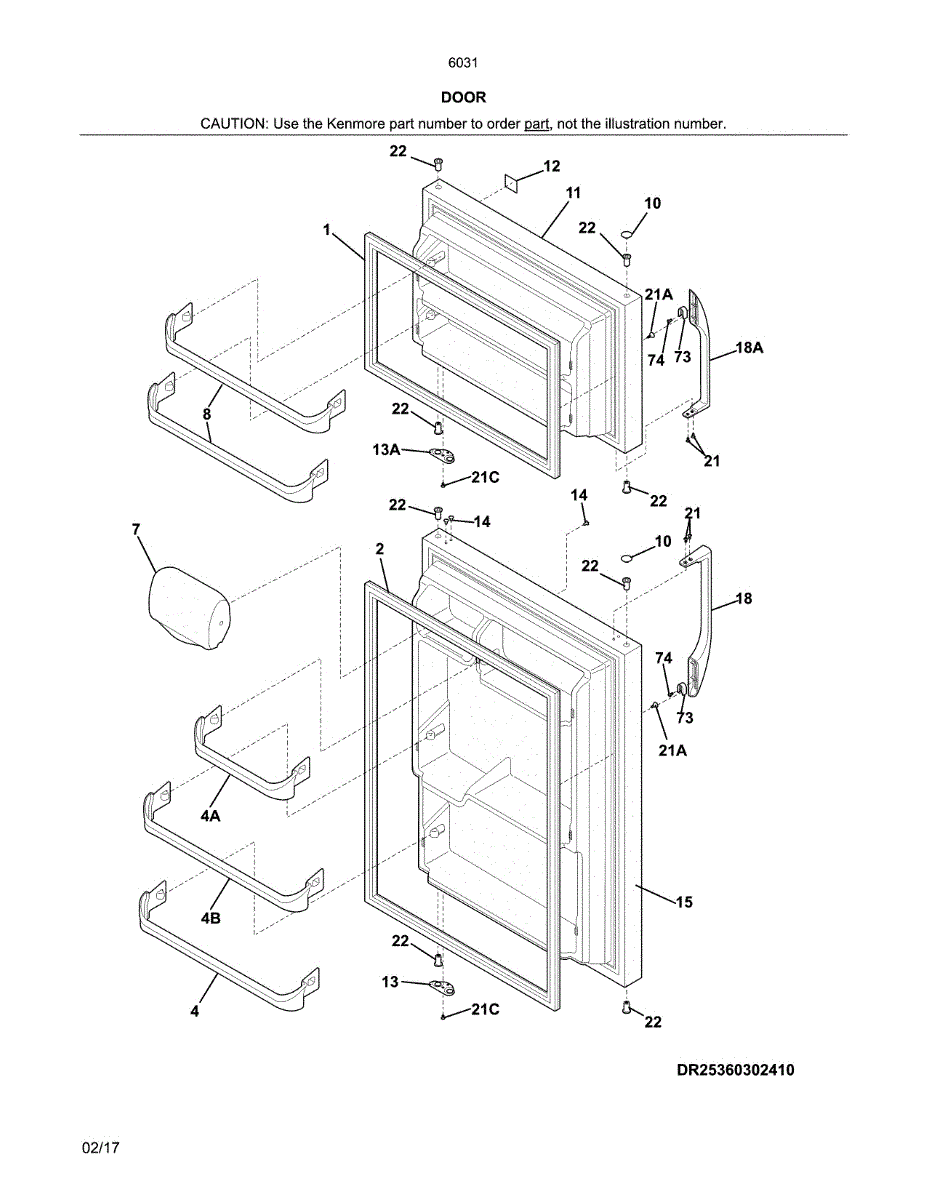 Complete refrigerator door assembly for top-mount models. Replacement needed when door is cracked, damaged, warped, or seals are permanently worn.
