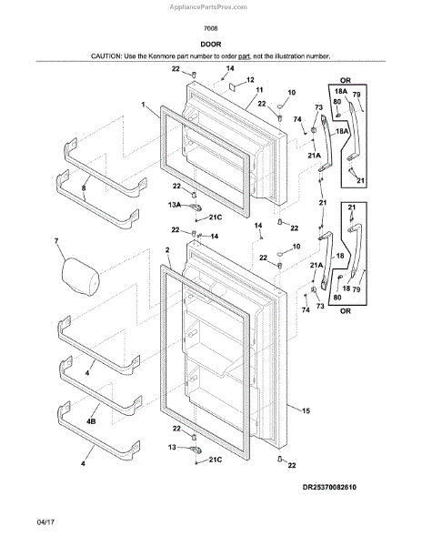 This door stop limits the opening angle of the refrigerator/freezer door to prevent overextension that can stress hinges or strike nearby cabinets. Replacing a worn or missing stop restores controlled door travel and helps prevent impact damage.
