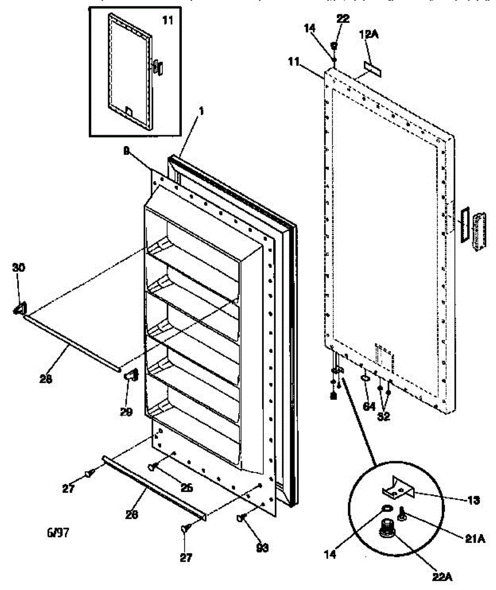 Plastic plug insert for freezer door base. Covers screw holes or mounting points. Replace if cracked, missing, or worn to restore a clean appearance.