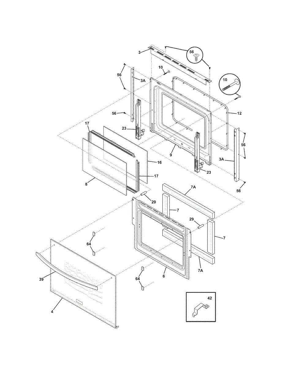 Inner door glass panel for range and wall oven doors. Replace if cracked, shattered, or slipped out of position. Installs between outer glass and oven cavity.