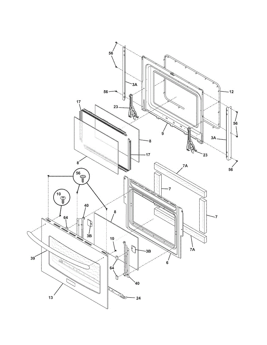Inner door glass panel for range and wall oven doors. Replace if cracked, shattered, or slipped out of position. Installs between outer glass and oven cavity.