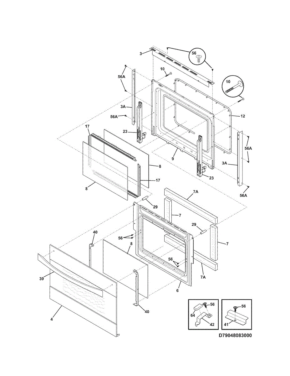 Mounting screw for electric range and wall oven assembly. Secures internal components and panels. Replace if stripped, missing, or damaged during repair.
