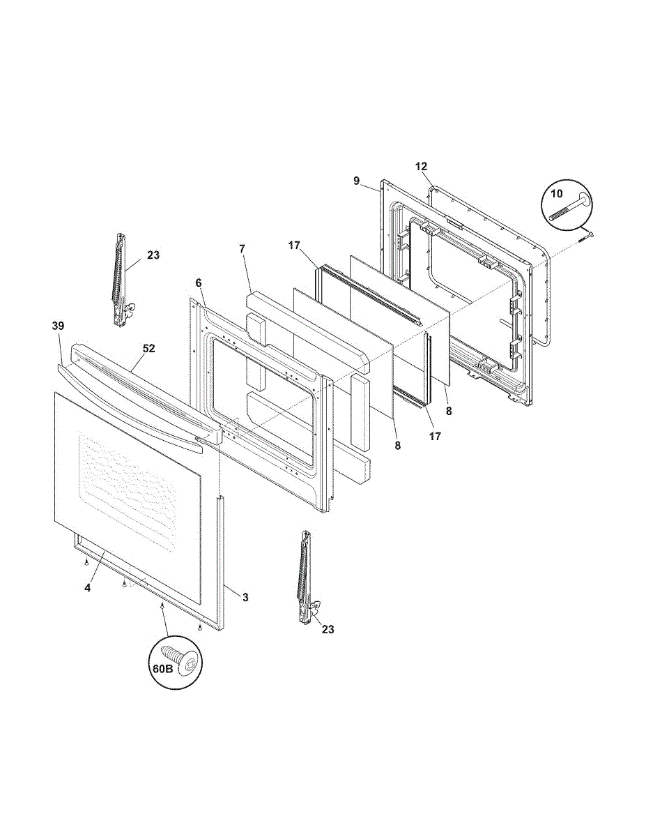 Inner door glass panel for range and wall oven doors. Replace if cracked, shattered, or slipped out of position. Installs between outer glass and oven cavity.