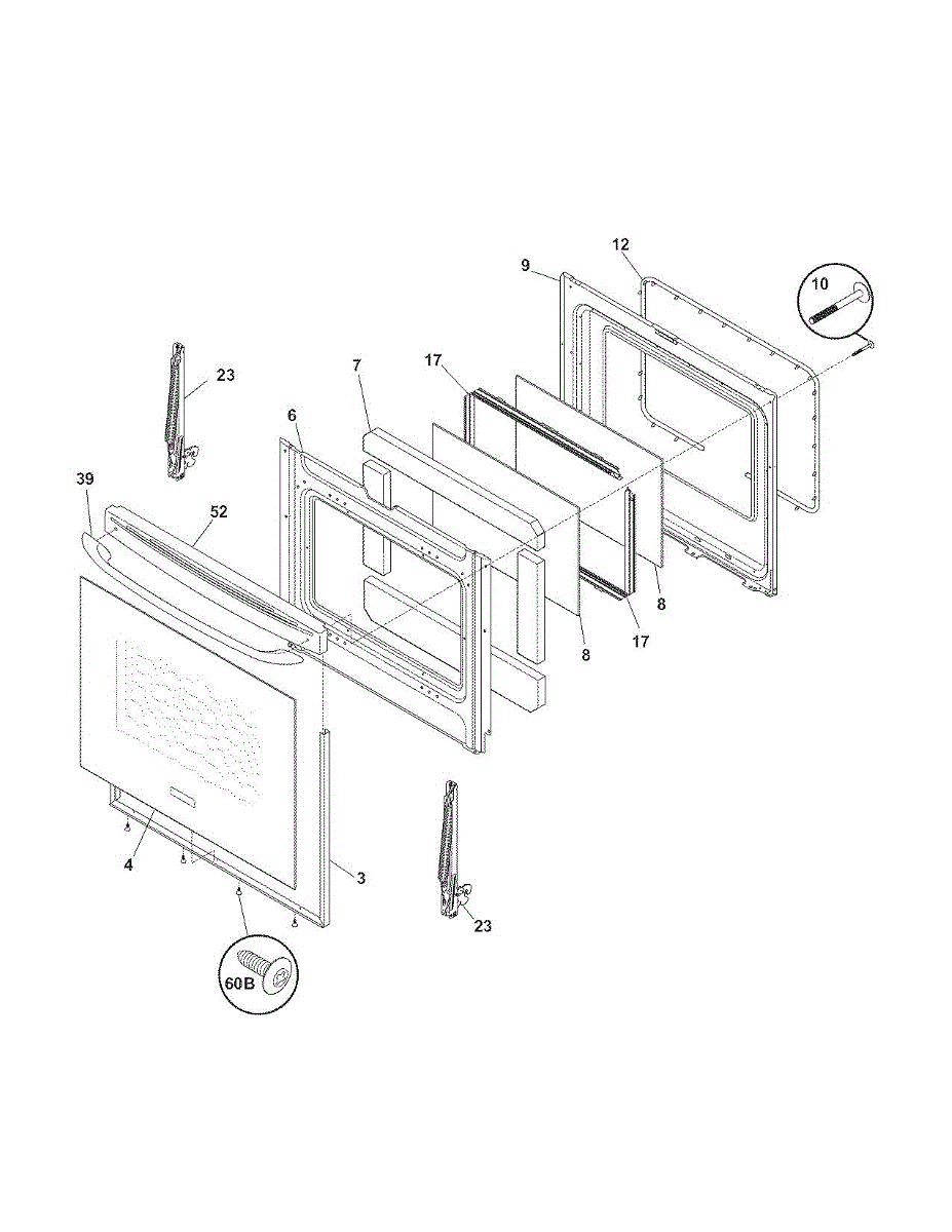 Inner door glass panel for range and wall oven doors. Replace if cracked, shattered, or slipped out of position. Installs between outer glass and oven cavity.