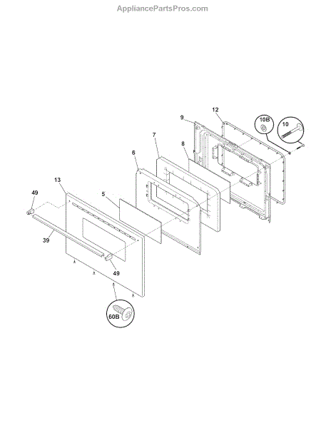 Black outer glass panel for gas range oven doors. Replaces cracked, shattered, or broken exterior door glass. Restores oven door appearance and integrity.