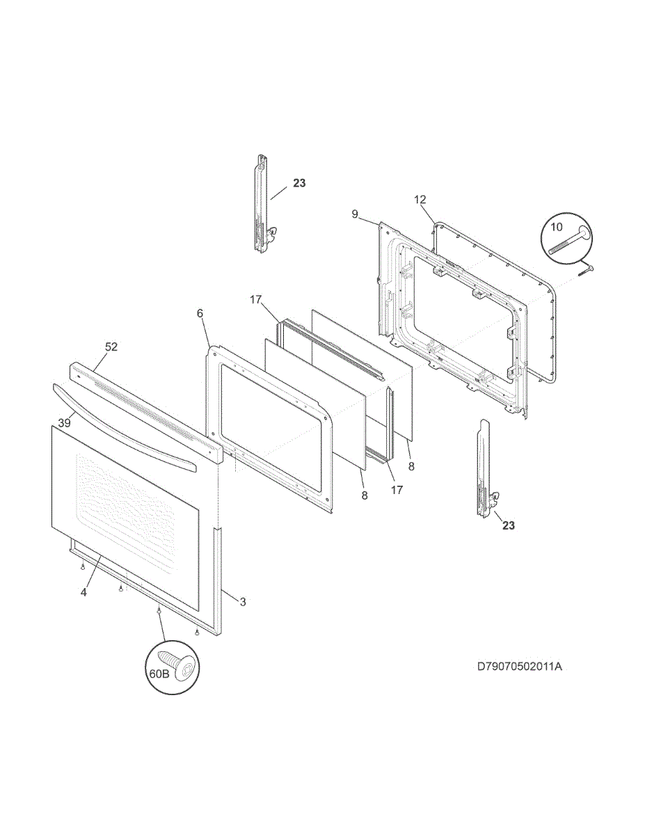 Inner door glass panel for range and wall oven doors. Replace if cracked, shattered, or slipped out of position. Installs between outer glass and oven cavity.