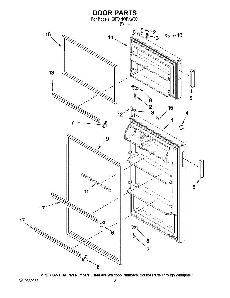 White door handle for top-mount refrigerators. Replaces cracked, broken, or loose handles. Mounts to the exterior door for easy opening and closing.