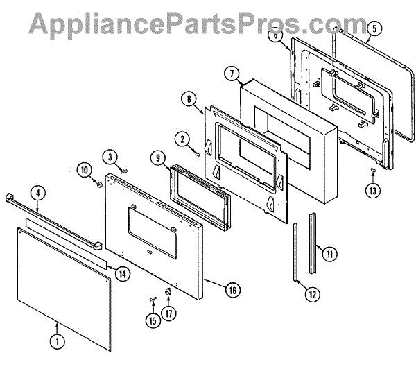 Spacer that fits between inner and outer oven door glass panels to maintain proper gap and alignment. Replaces missing, cracked, or damaged spacers.