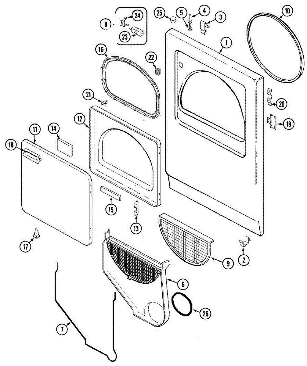 Traps lint and debris during drying to prevent vent clogs and maintain airflow. Replace when damaged, torn, or has holes. Verify fit with your model.