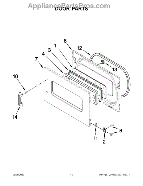 This factory hinge supports and pivots the appliance door so it opens smoothly and closes square to the cabinet. Replacing a worn or bent hinge restores proper alignment, sealing, and overall door feel.