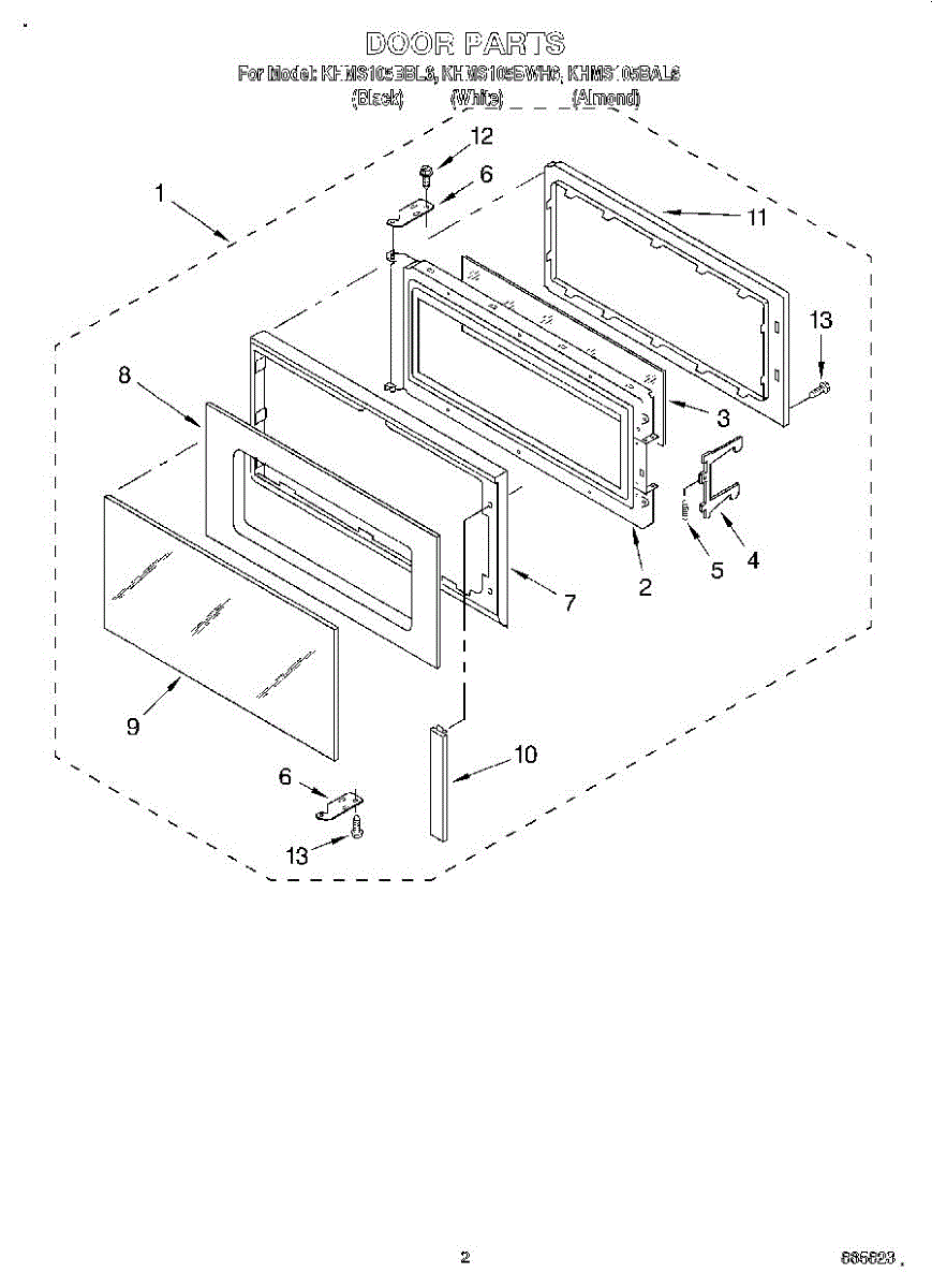 Mounting screw for microwaves. Secures door panels, handles, and internal components. Replace if stripped, missing, or damaged during repairs.