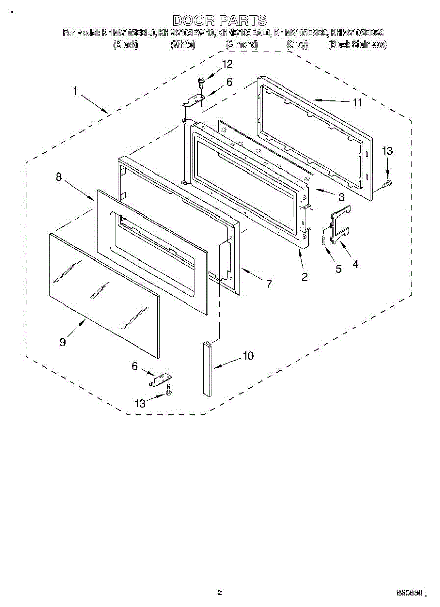 Mounting screw for microwaves. Secures door panels, handles, and internal components. Replace if stripped, missing, or damaged during repairs.