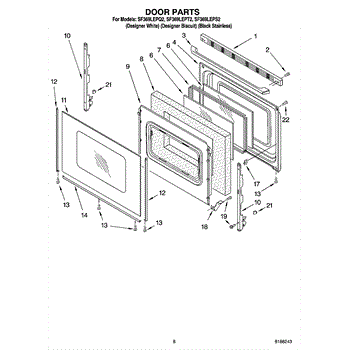 Decorative trim piece for range oven door side edge. Replace if cracked, broken, or missing after disassembly. Left-hand white trim installs along door.