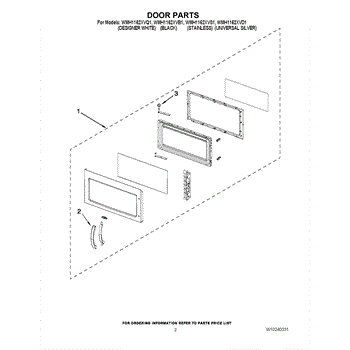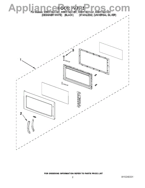 This white microwave door replaces a damaged or worn outer door assembly to restore appearance and safe operation. It provides the exterior panel and handle mounting surface for a finished cabinet look. What it does: