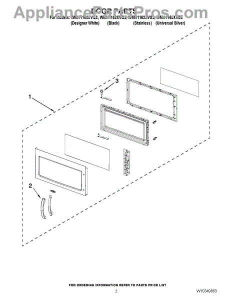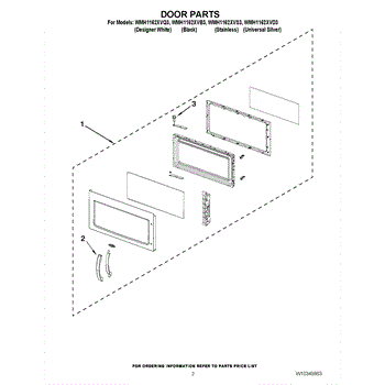 This white microwave door replaces a damaged or worn outer door assembly to restore appearance and safe operation. It provides the exterior panel and handle mounting surface for a finished cabinet look. What it does: