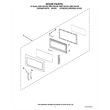 This white microwave door replaces a damaged or worn outer door assembly to restore appearance and safe operation. It provides the exterior panel and handle mounting surface for a finished cabinet look. What it does: