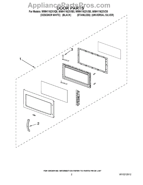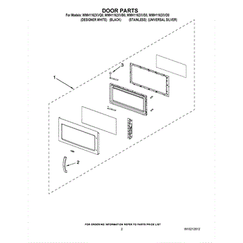 This white microwave door replaces a damaged or worn outer door assembly to restore appearance and safe operation. It provides the exterior panel and handle mounting surface for a finished cabinet look. What it does: