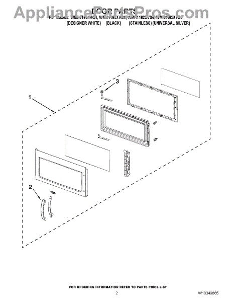This white microwave door replaces a damaged or worn outer door assembly to restore appearance and safe operation. It provides the exterior panel and handle mounting surface for a finished cabinet look. What it does: