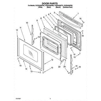 Decorative trim piece for range oven door side edge. Replace if cracked, broken, or missing after disassembly. Left-hand white trim installs along door.