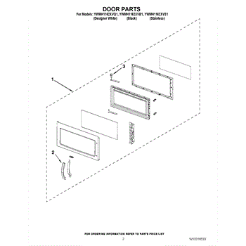 This white microwave door replaces a damaged or worn outer door assembly to restore appearance and safe operation. It provides the exterior panel and handle mounting surface for a finished cabinet look. What it does: