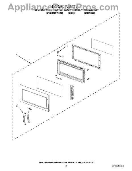 This white microwave door replaces a damaged or worn outer door assembly to restore appearance and safe operation. It provides the exterior panel and handle mounting surface for a finished cabinet look. What it does: