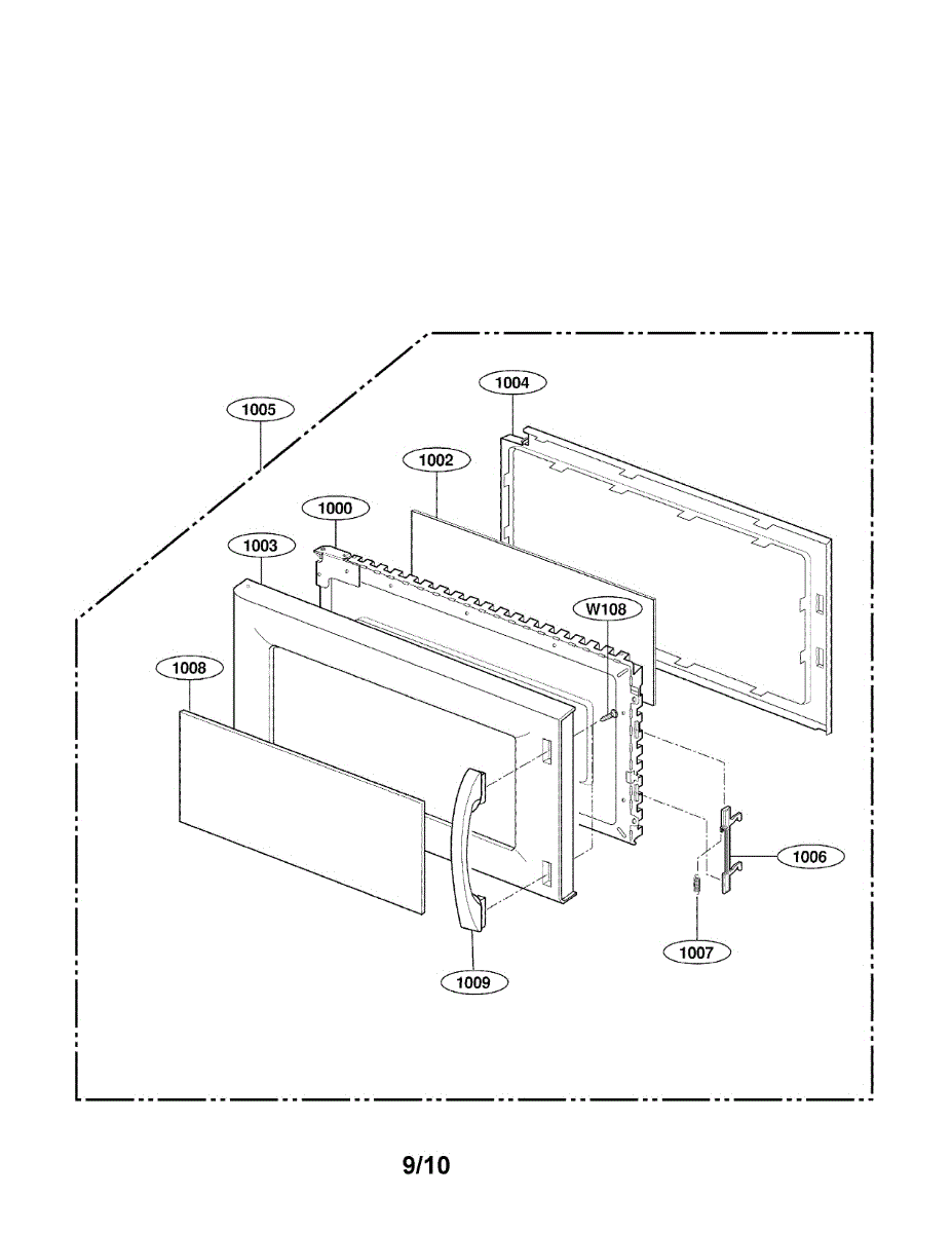 This is the inner door frame assembly for a microwave oven. It provides the structural support for the door's window, trim, handle, and latch so the door aligns and closes properly and the interlock switches engage.