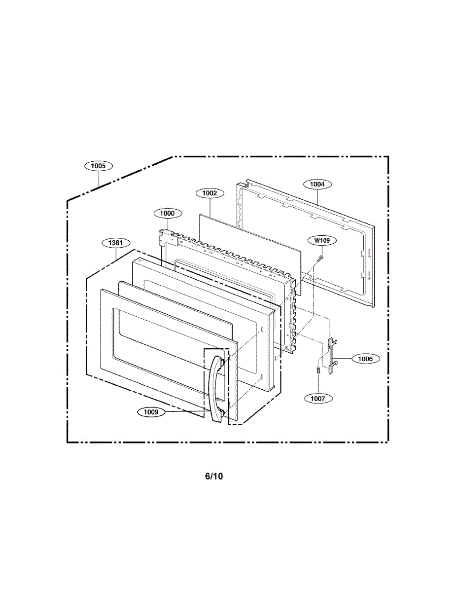 This is the inner door frame assembly for a microwave oven. It provides the structural support for the door's window, trim, handle, and latch so the door aligns and closes properly and the interlock switches engage.