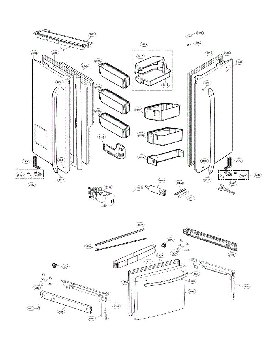 The Basket Assembly is an OEM component specifically designed for LG Door-in-Door refrigerators containing bottom-mounted crisper drawers. This integral assembly organizes stored items within the refrigerator doorway.
