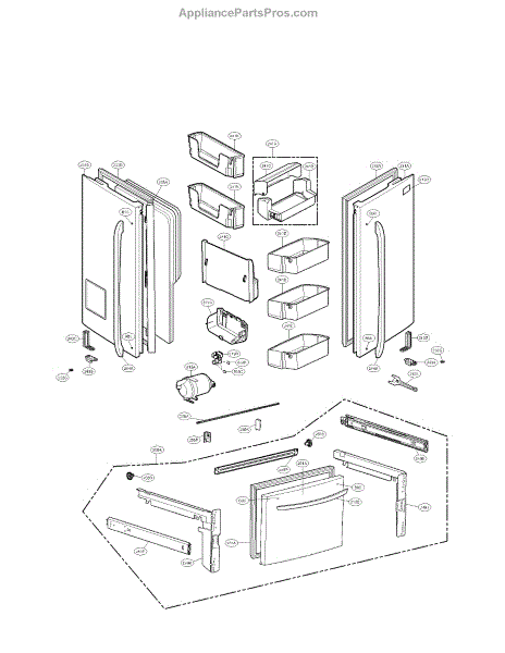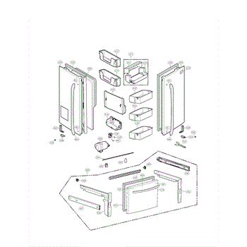 Door basket assembly for LG refrigerators. Mounts inside refrigerator door to organize and store items. Replace if cracked, broken, or damaged from wear.