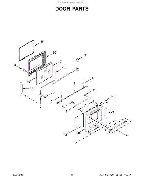 This door liner is the oven's inner door panel that helps protect the door cavity and support the inner glass. Replaces a damaged or worn liner to restore a clean interior surface and proper glass fit. What it does: