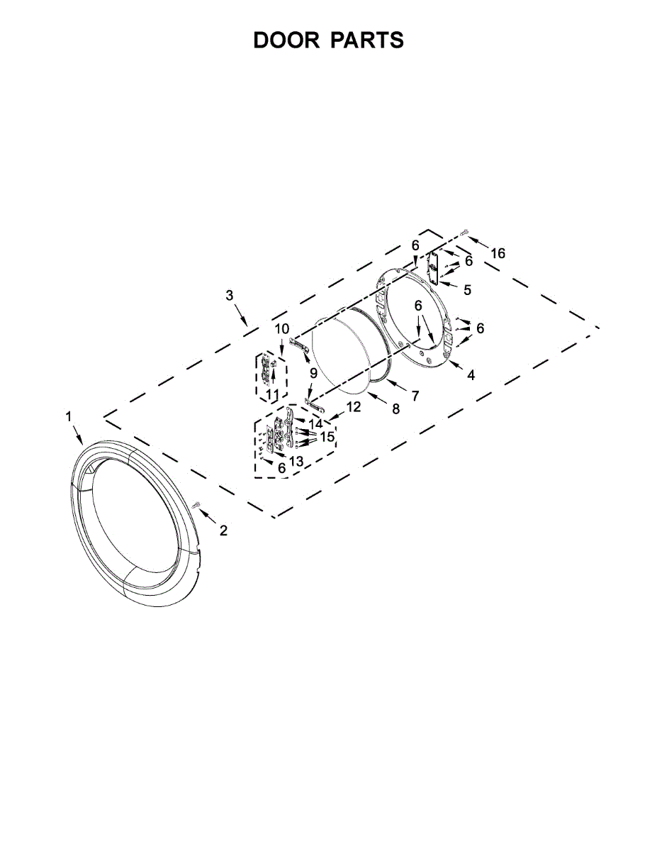 Replacement door hinge for dryers. Secures and aligns the door to the cabinet. Replace if cracked, broken, sagging, or causing door misalignment.