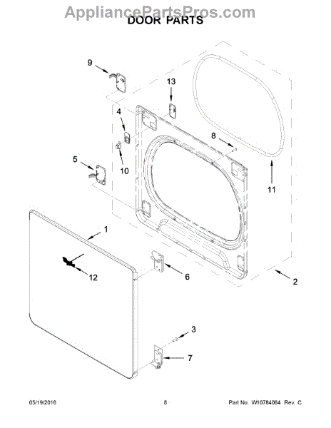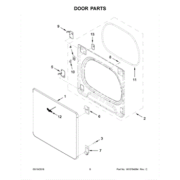 Complete dryer door assembly that installs on the front of your appliance. Replace if your door is cracked, broken, won't latch properly, or damaged.