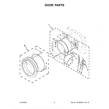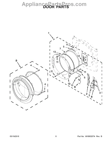Causes of a bad dryer door catch can include normal wear and tear from frequent use, accidental damage, or deformation of the catch or latch that prevents proper engagement. Over time, the door catch can become loose or break, necessitating replacement to maintain the dryer's performance and safety.