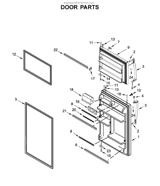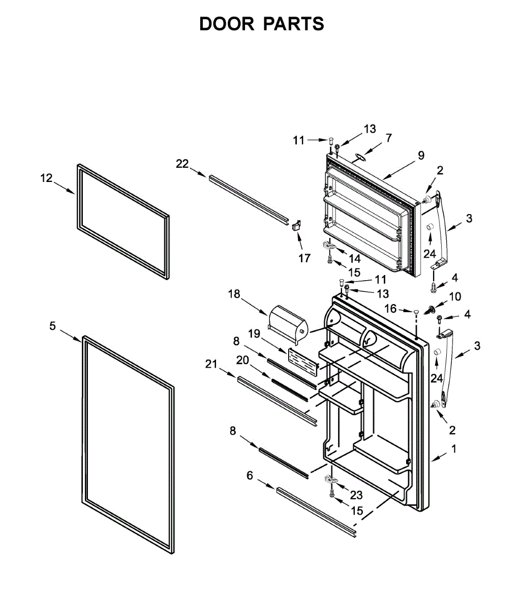 Complete door assembly for top-mount refrigerators. Replaces cracked, damaged, or warped doors that no longer seal or close properly. Restores appearance.