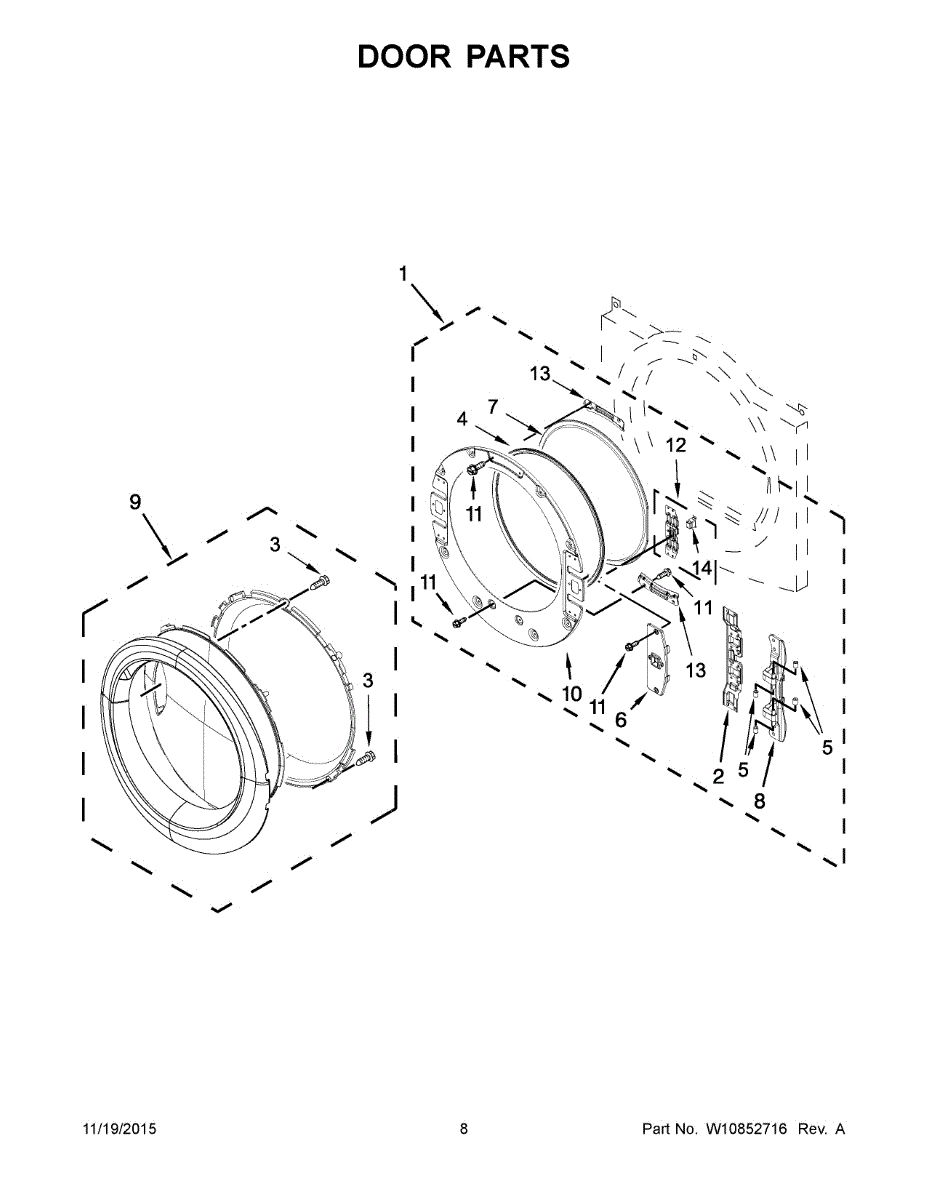 Replacement door hinge for front-load washers and dryers. Attaches door to cabinet for smooth opening and closing. Needed when hinge is cracked or worn.