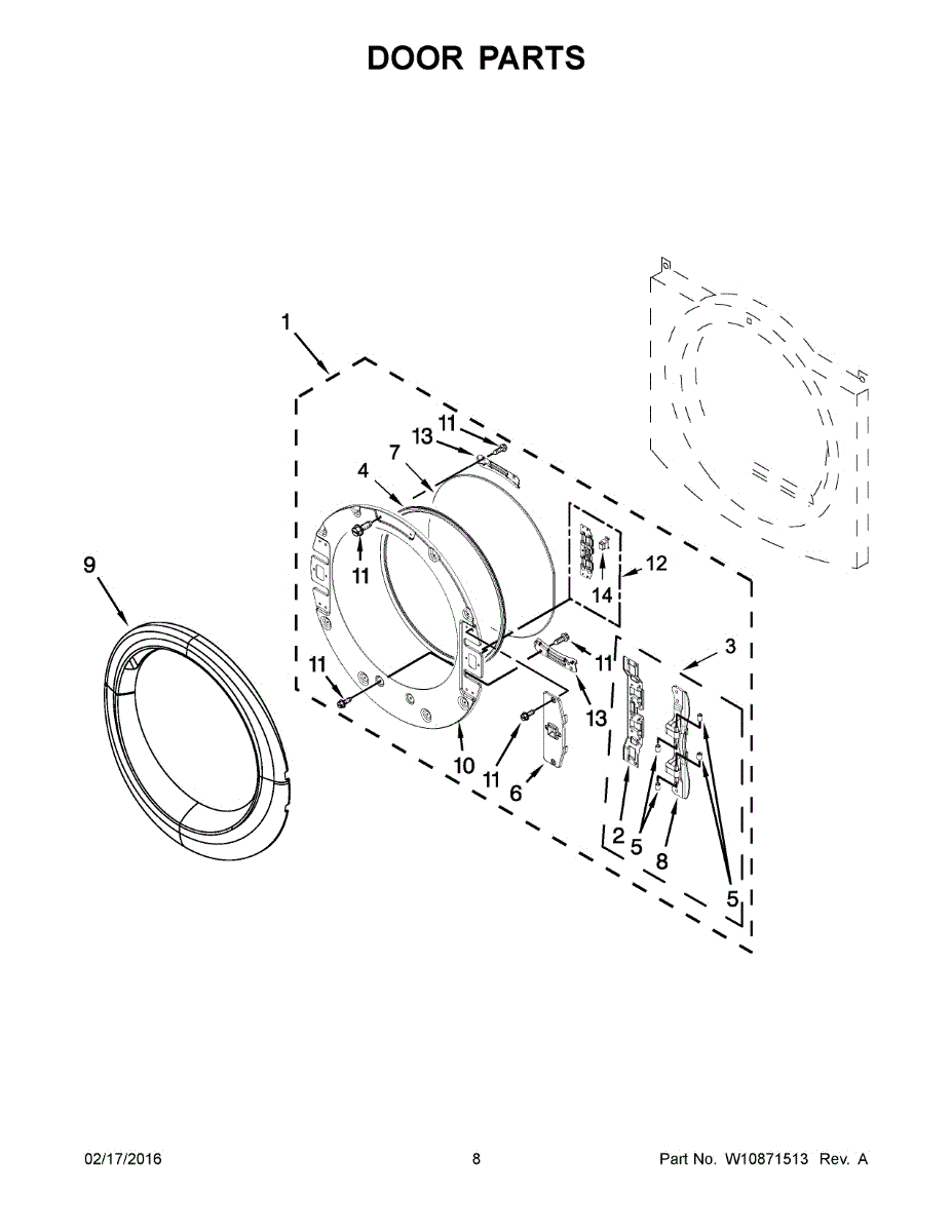 Causes of a bad dryer door catch can include normal wear and tear from frequent use, accidental damage, or deformation of the catch or latch that prevents proper engagement. Over time, the door catch can become loose or break, necessitating replacement to maintain the dryer's performance and safety.
