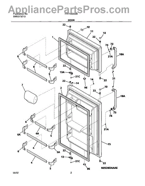 This door stop limits the opening angle of the refrigerator/freezer door to prevent overextension that can stress hinges or strike nearby cabinets. Replacing a worn or missing stop restores controlled door travel and helps prevent impact damage.