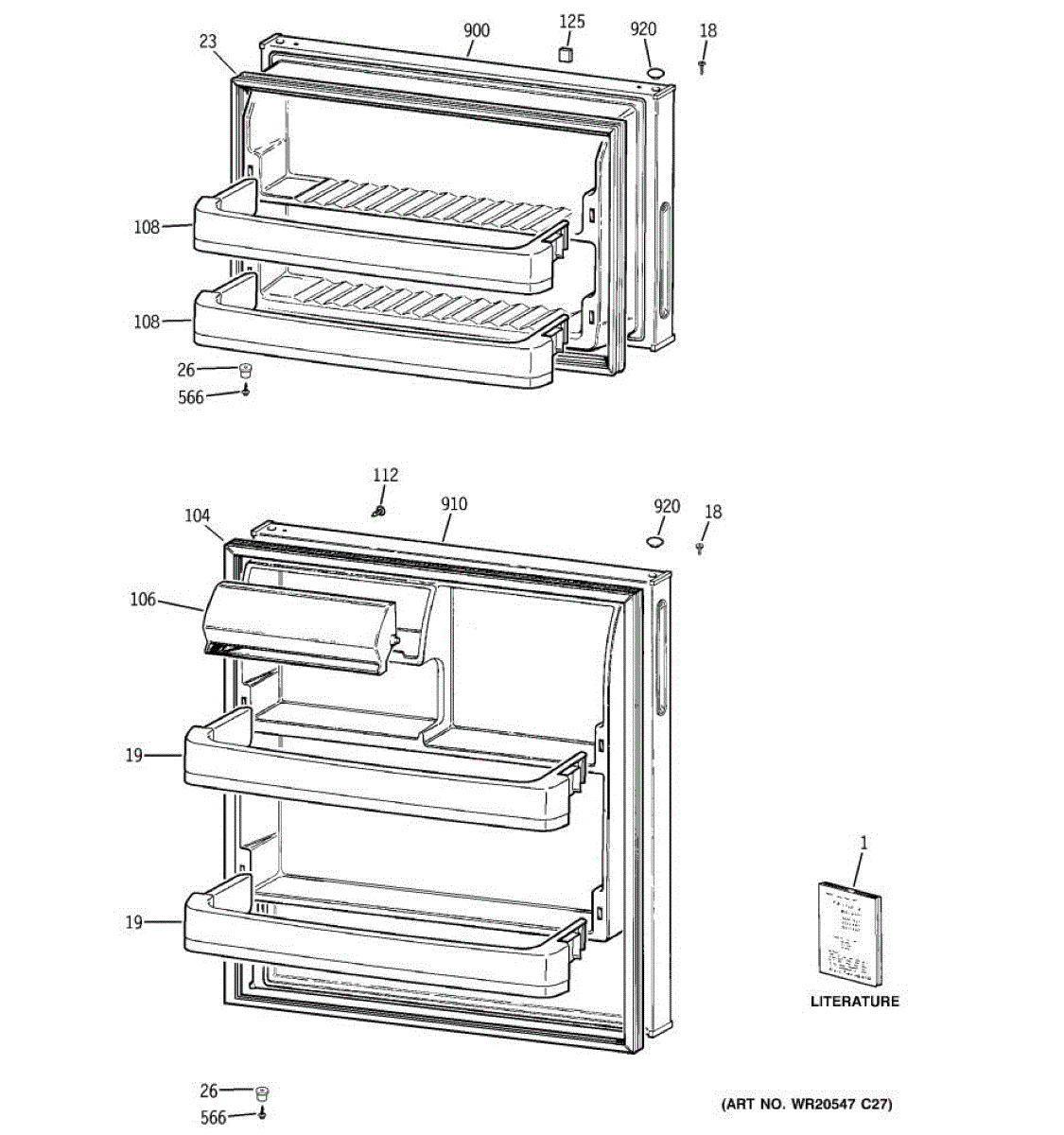 Outer door panel for top-mount refrigerator freezer compartment. Replaces cracked, dented, or discolored panels. Reuses existing handle and shelves.