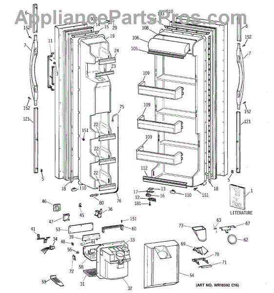 The Ice Door Assembly is an OEM part for GE refrigerators. It is integral to the ice dispenser system, controlling access to the ice chute. This component ensures the efficient delivery of ice cubes or crushed ice when activated and seals off the chute when not in use to maintain the freezer's temperature and prevent frost buildup.