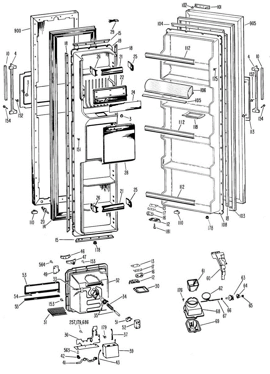 Hardware fasteners for securing refrigerator door panels and components. Includes screws, nuts, and washers for assembly. Replace missing or stripped pieces.