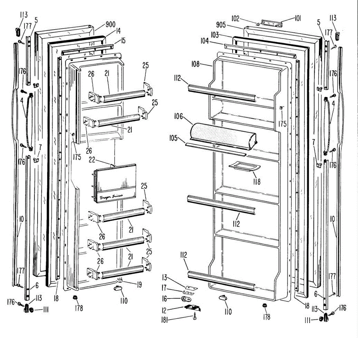 Hardware fasteners for securing refrigerator door panels and components. Includes screws, nuts, and washers for assembly. Replace missing or stripped pieces.