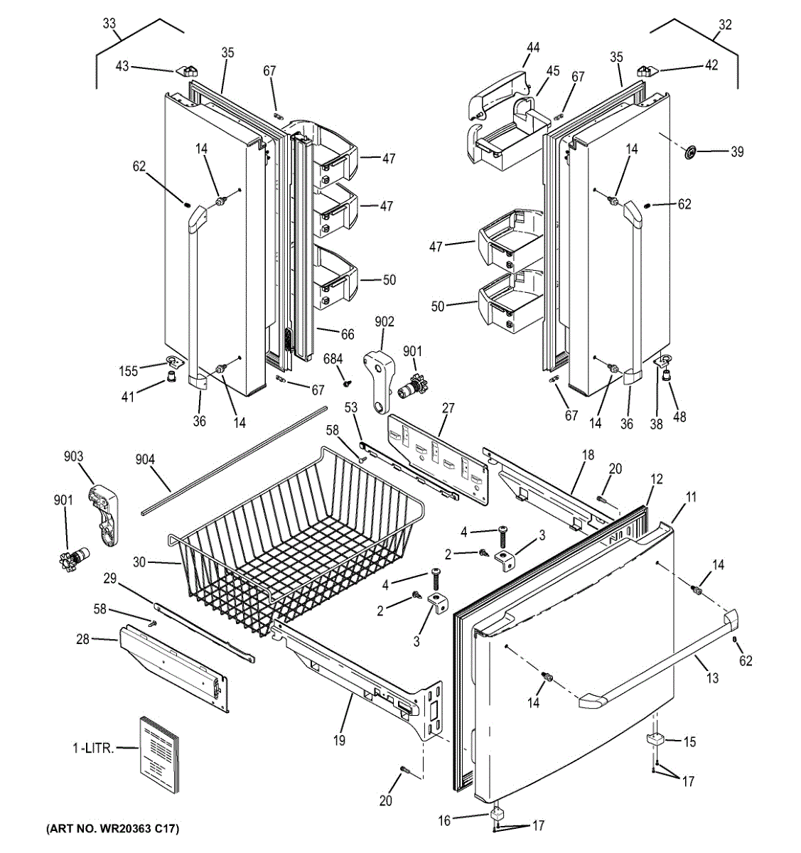 Lower freezer basket for GE refrigerators. Installs in the bottom freezer compartment to organize frozen items. Replace if cracked, broken, or worn.