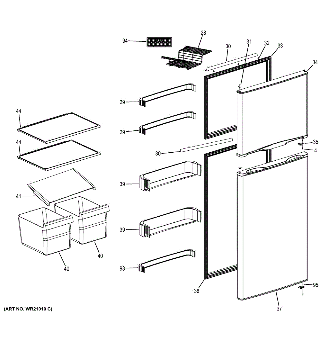 Seals freezer door to prevent cold air loss and frost buildup. Replace if damaged, cracked, or no longer sealing properly. Confirm fit with model number.