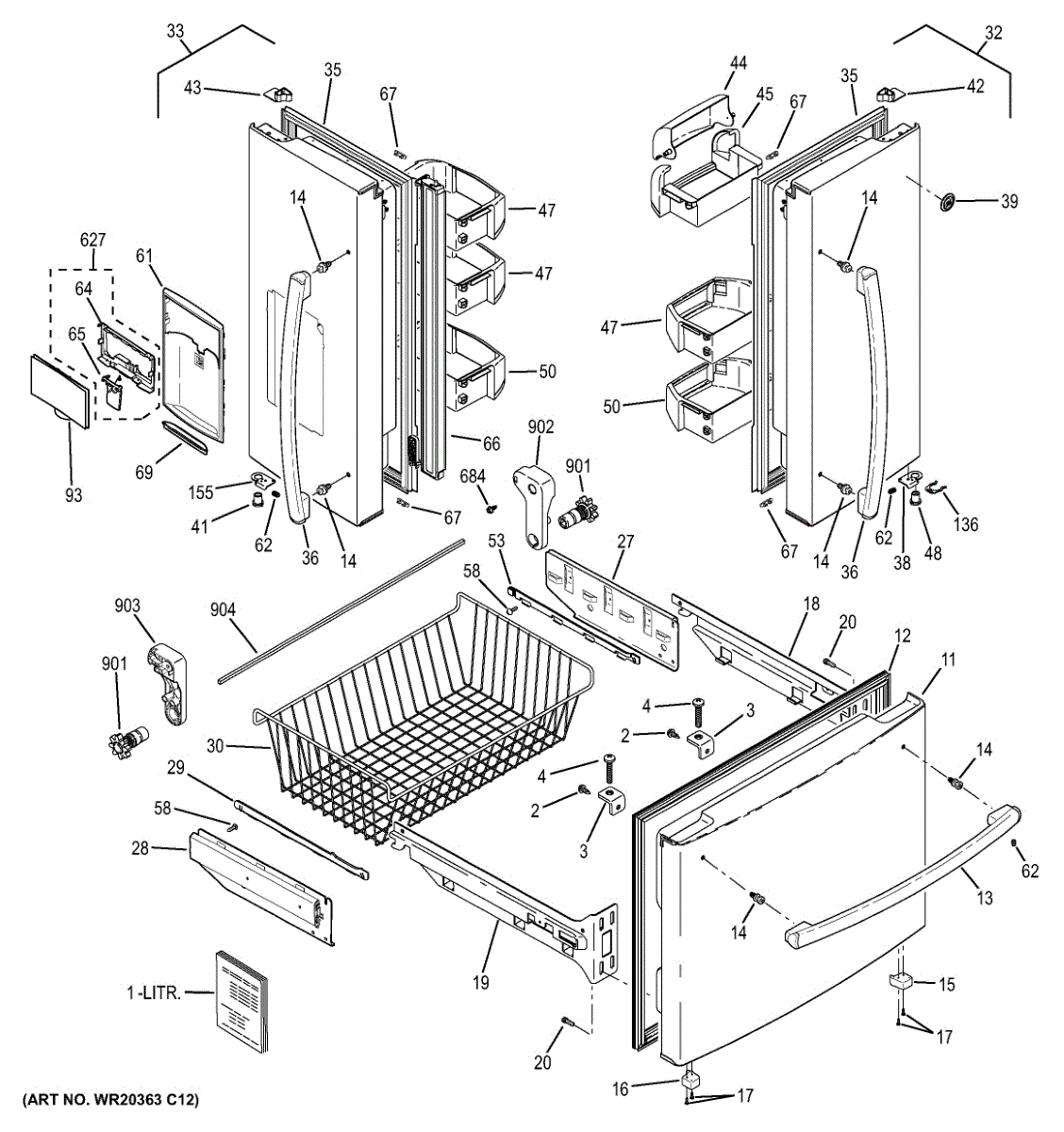 Lower freezer basket for GE refrigerators. Installs in the bottom freezer compartment to organize frozen items. Replace if cracked, broken, or worn.