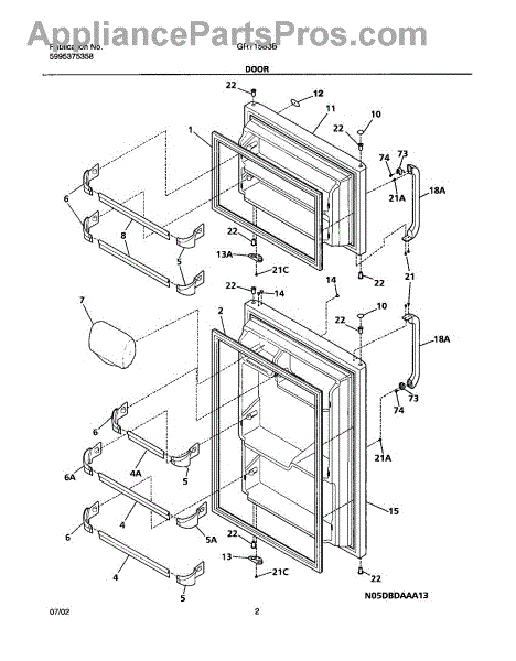This door stop limits the opening angle of the refrigerator/freezer door to prevent overextension that can stress hinges or strike nearby cabinets. Replacing a worn or missing stop restores controlled door travel and helps prevent impact damage.
