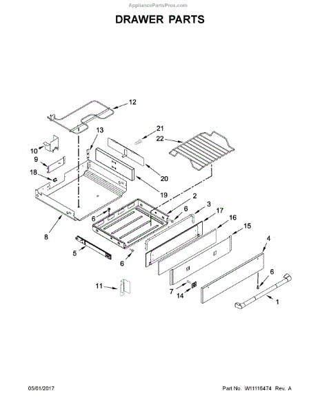 Replacement utility drawer assembly for ranges and wall ovens. Restores organized storage space under your appliance when original is cracked, broken, or worn.