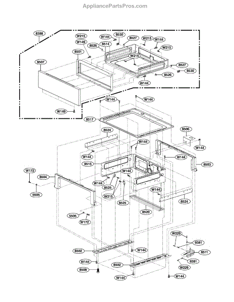This replacement door frame restores the exterior trim around the appliance door for a finished appearance and proper panel alignment. It helps seal and support the door while keeping the control area and window secure. What it does: