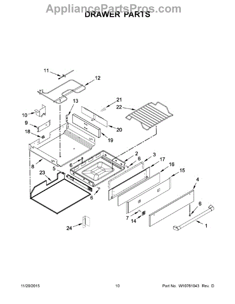Replacement utility drawer assembly for ranges and wall ovens. Restores organized storage space under your appliance when original is cracked, broken, or worn.