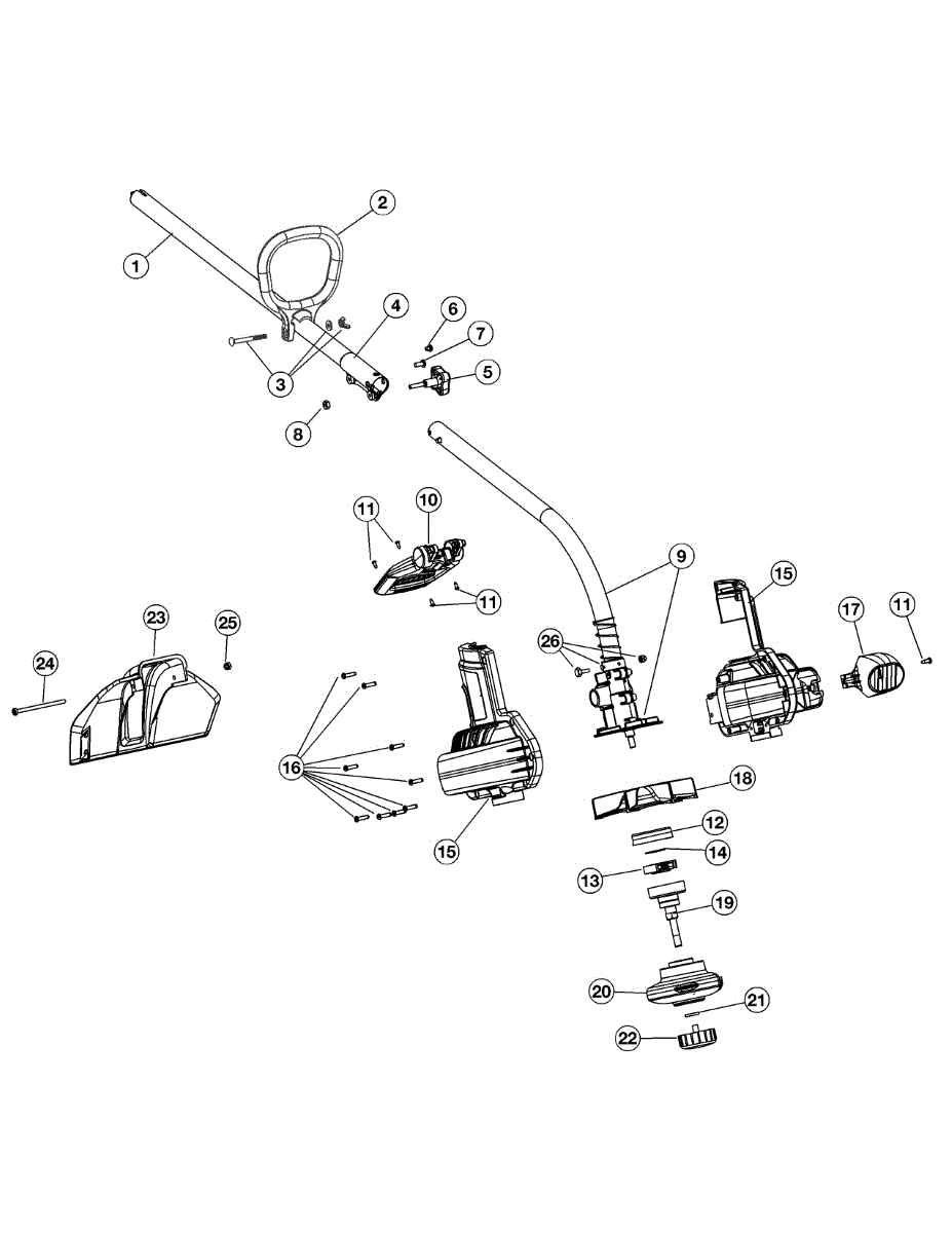 Housing assembly for electric and gas line trimmers. Replaces cracked, broken, or damaged housing that protects internal components. Direct fit.