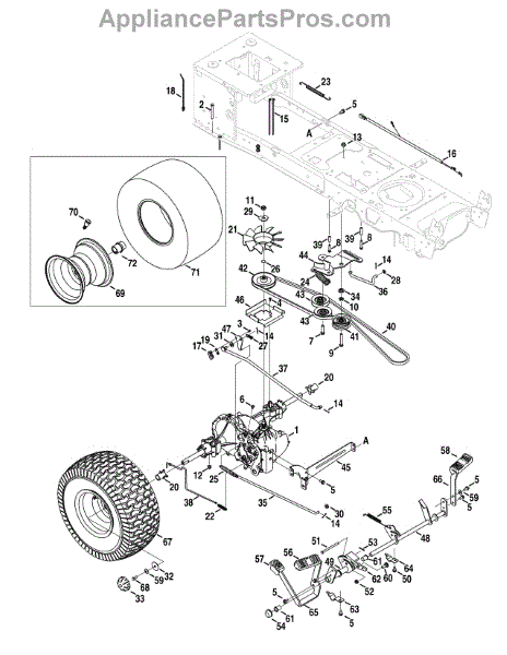 Input pulley for front-engine lawn tractors. Mounts to the transmission system to transfer power from the drive belt. Replace if cracked or worn.